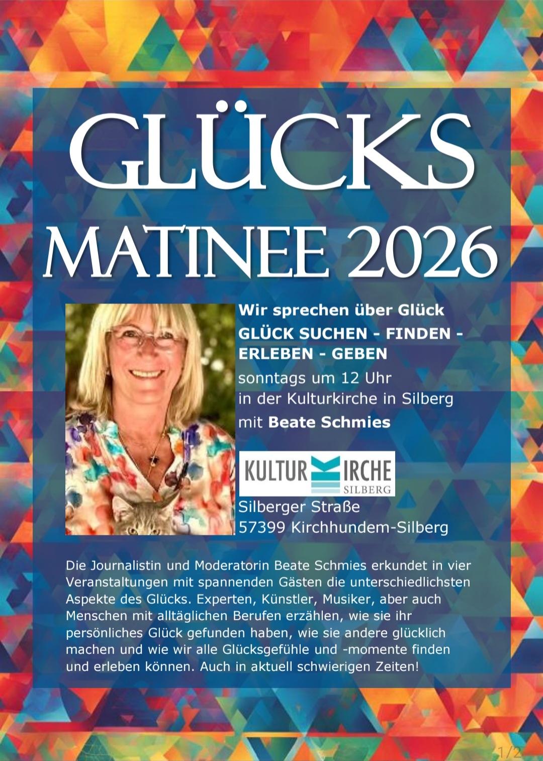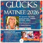 17. Mai 2026 – 12.00 Uhr Glücksmatinee „Dankbarkeit macht glücklich“ – Zu Gast bei der Journalistin Beate Schmies Wo: Kulturkirche Silberg, Silberberger Straße, 57399 Kirchhundem-Silberg